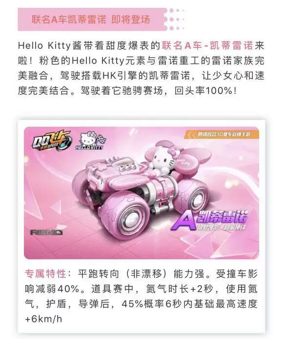Hello Kitty酱带着甜度爆表的联名A车-凯蒂雷诺来啦!粉色的Hello Kitty元素与雷诺重工的雷诺家族完美融合,驾驶搭载HK引擎的凯蒂雷诺,让少女心和速度完美结合。驾驶着它驰骋赛场,回头率100%!