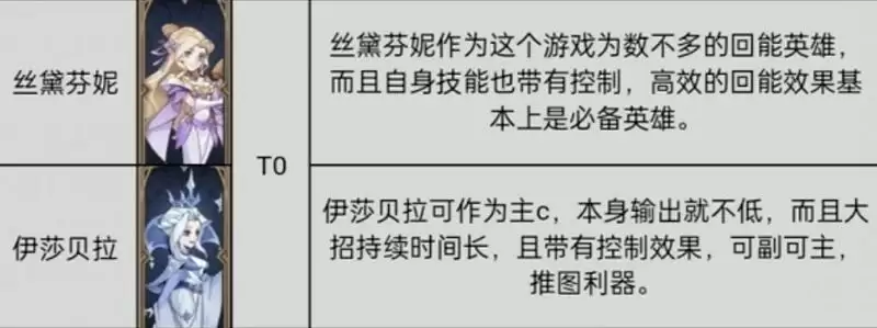 1、T0级别:丝黛芬妮、伊莎贝拉。这两位角色都有控制技能,两个角色结合起来技能非常全面。