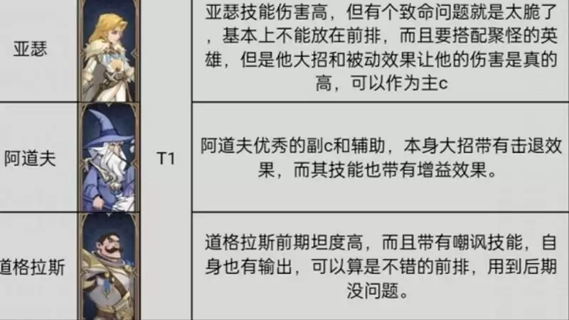 2、T1级别:亚瑟、阿道夫、道格拉斯。这三位角色配合刚好可以弥补空缺。