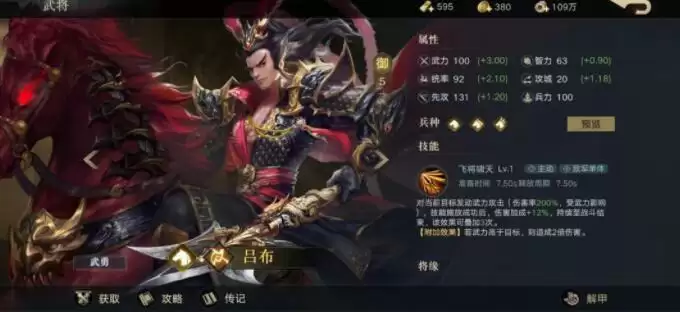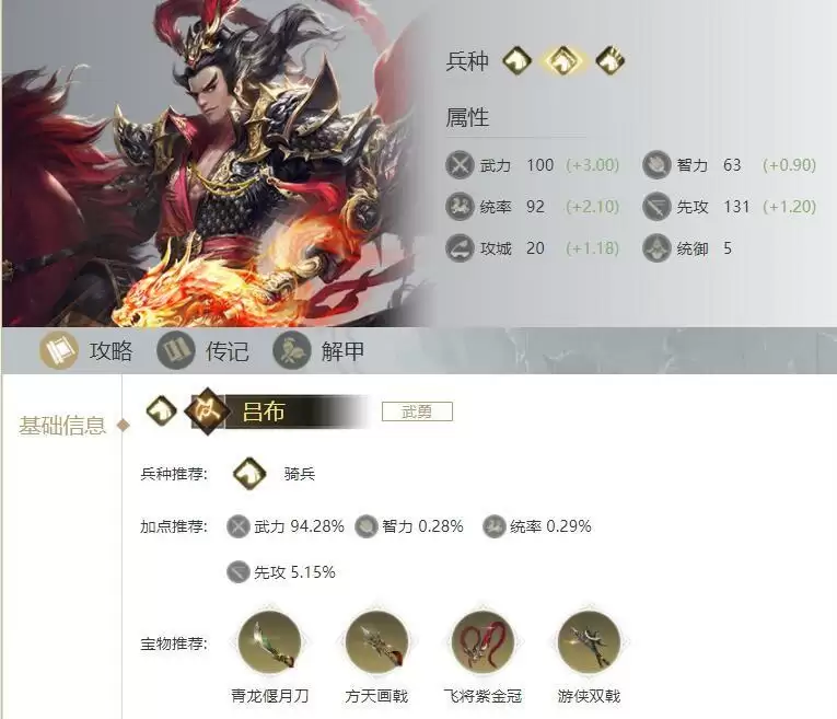 游侠双戟在武力高于目标时,技能伤害也会变为两倍,与武力基础值及上限值均为最高的汉·吕布的属性无疑是极好的。而青龙偃月刀的技能物理伤害率极高,在目标兵力低于50%时,同样能让该次伤害变为两倍。