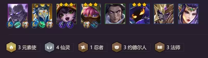 2、阵容分析:3元素可以召唤魔像作为前排,4仙灵快速的释放技能并减少对面法力值,约德尔人对普通攻击有几率闪避。