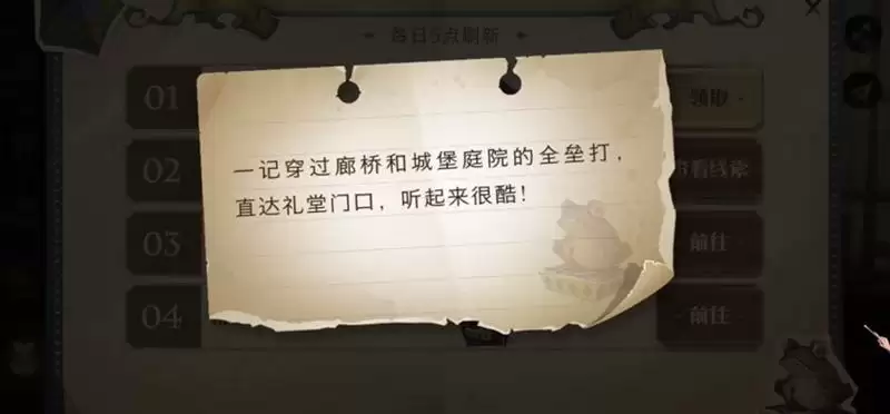 巧克力蛙第四天收集任务已经更新,今天的线索是“一记穿过廊桥和城堡庭院的全垒打直达礼堂门口,听起来很酷!”这个线索就是比较简单一些,毕竟城堡庭院和廊桥的信息就已经很明确了,那么下面我们就来看下具体内容吧,