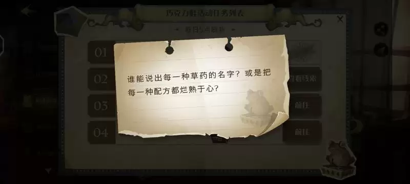 《哈利波特魔法觉醒》巧克力蛙NPC第五天攻略,通过线索“谁能说出每―种草药的名字?或是把每一种配方都烂熟于心”,我肯可以发现文字当中涉及要药物以及配方,所以就可以缩小范围,那么我们下面就来具体看下NPC的位置。