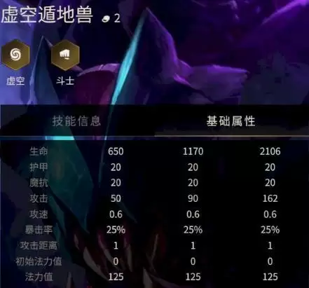 4、技能效果:虚空遁地兽朝目标释放技能遁入地下,1星时、2星时、3星时,在遁地期间分别回复150/300/450的生命值,当遁地兽破土而出造成伤害分别造成200、355、650伤害并击飞当前目标1.75秒。(如下图所示)