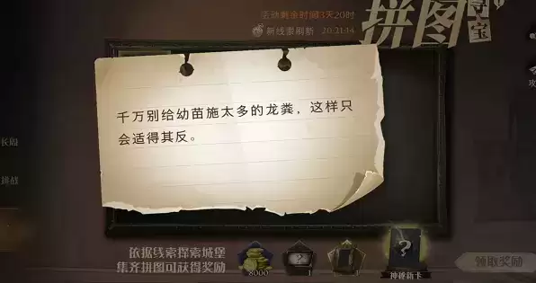 哈利波特第二期拼图寻宝在9月22日正式开启,其中的一个碎片线索为“千万别给幼苗施太多的龙粪,这样只会适得其反”,这个碎片是在哪个地方获取呢,下面我们来看下具体的线索攻略内容。