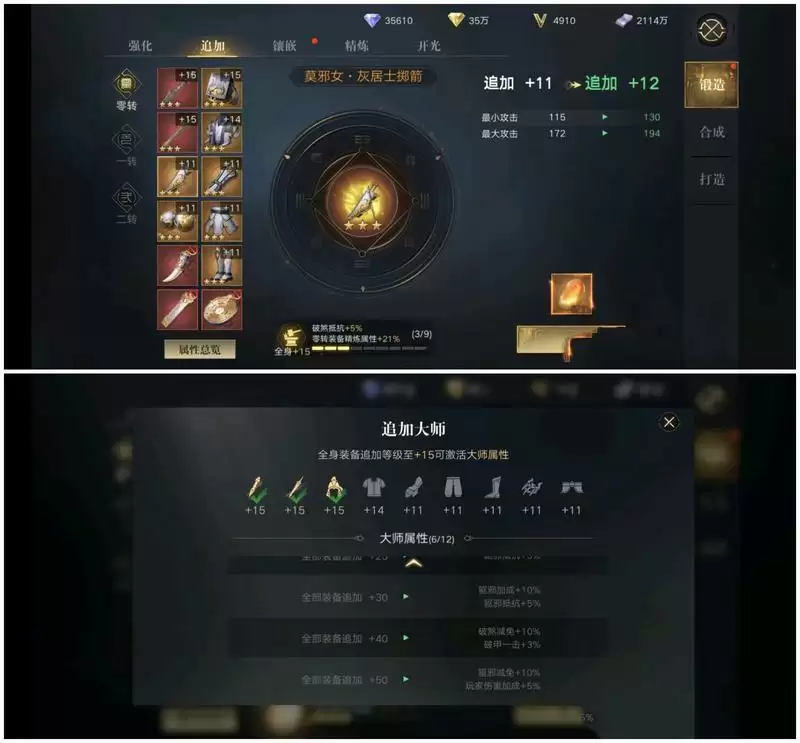 除了上边说到的精炼,还有我认为本游戏最大的氪金点之一追加,追加,顾名思义,给予装备一些附加的提升,同转9件装备全部追加到一定等级,会解锁额外属性,最高50追加,想想都可怕!为什么说是最大的氪金点之一,因为追加石只能通过每周得礼包以及声望获取,声望每周最多换50个,一个300威望。