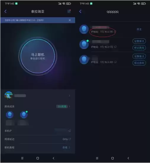 回到联机话题,在联机“房间成员”里把房主IP分享给开黑伙伴,点击“马上联机”后打开游戏客户端,通过这个IP我们在“泰拉瑞亚”中直接输入IP就能进入房主创建的世界中。