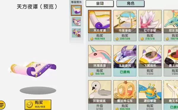 2、天方夜谭一共有三个等级,第二级叫做波斯飞毯,多了一些装饰,可以搭乘两名乘客。第三季叫做星月魔毯,装饰拼还是比较多的,而且还有神隐技能,可以进入到隐身状态中。