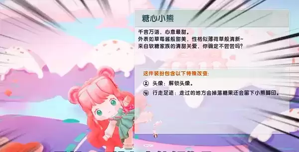 3、千言万语,心意最甜。外表如草莓酱般甜美,性格似薄荷草般清新—来自软糖家族的清甜关爱,你确定不尝尝吗?这件装扮包含以下特殊改变:头像:解锁头像。行走足迹:走过的地方会掉落糖果还会留下小熊脚印。