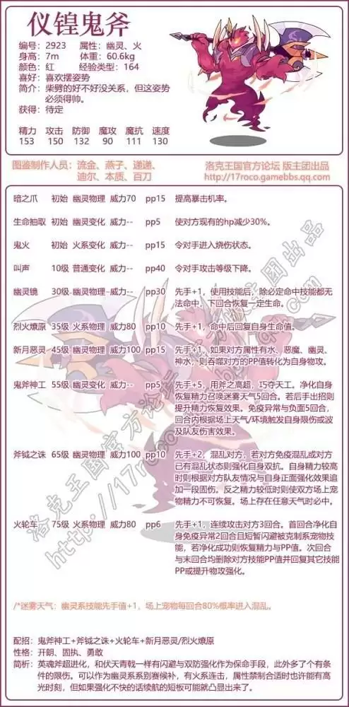 《洛克王国》仪锽鬼斧是英魂斧超进化获取的宠物,技能搭配上推荐:鬼斧神工+斧钺之诛+火轮车+新月恶灵/烈火燎原,可以作为幽灵系系别赛候补成员。