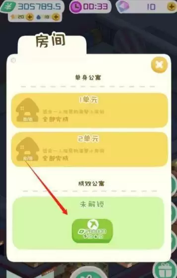 满足解锁条件之后,在右下角有一个“施工”(房间界面),进入之后往下拉,然后看到解锁双人公寓,消耗一定的钱/水/电即可解锁。