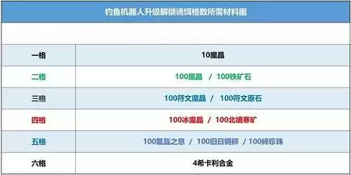 每个钓鱼机器人一共有六个可供使用的位置,冒险者都是单独使用每个机器人,点击使用诱饵数后面的加号,增加自己可以使用诱饵的数量,增加对应可使用诱饵数需要提交不同的材料,只要解锁一个地方的钓鱼机器人诱饵格子数,其他地方机器人都会解锁,可以理解为互通格子数。