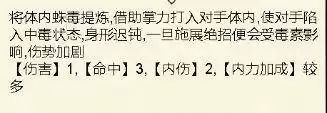 将体内蛛毒提炼,借助掌力打入对手体内,使对手陷入中毒状态身形迟钝,一旦施展绝招便会受毒素影响,伤势加剧[伤害] 1, [命中] 3, [内伤] 2, [内力加成]较。多