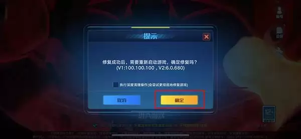 2. 点击提示框的“确定”按钮后,游戏会自动关闭,然后重新打开游戏即开始深度修复过程