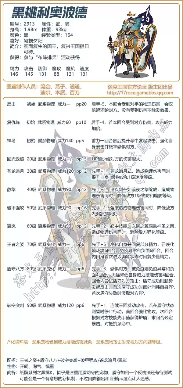 洛克王国黑桃利奥波德是纸牌系列的国王宠物,一手拿剑一手持盾,非常注意防御。配招推荐:王者之姿+盾守八方+破空突袭+破甲强攻/苍龙追月/翼岚。