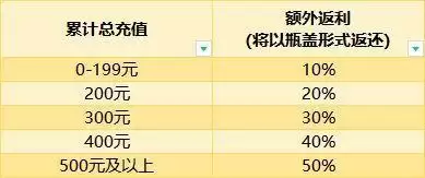 根据玩家的累积充值金额,不同的充值档次会有不同的额外返利比例,并在游戏正式上线后以瓶盖的形式返现,具体的返现规则如下表: