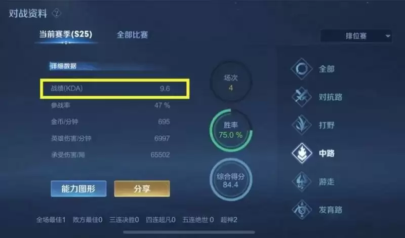 K指的是击杀次数、D指的是阵亡次数、A指的是助攻次数,KDA=(K+A)/ D,在个人游戏资料中可以看到自己的KDA数值。