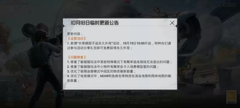 就在这天游戏更新了28.2M大小的内容,其中明确提到:新增“长草颜团子送永久外观”活动,将于10.19的10点开启,通过参与活动即可免费获得永久外观!