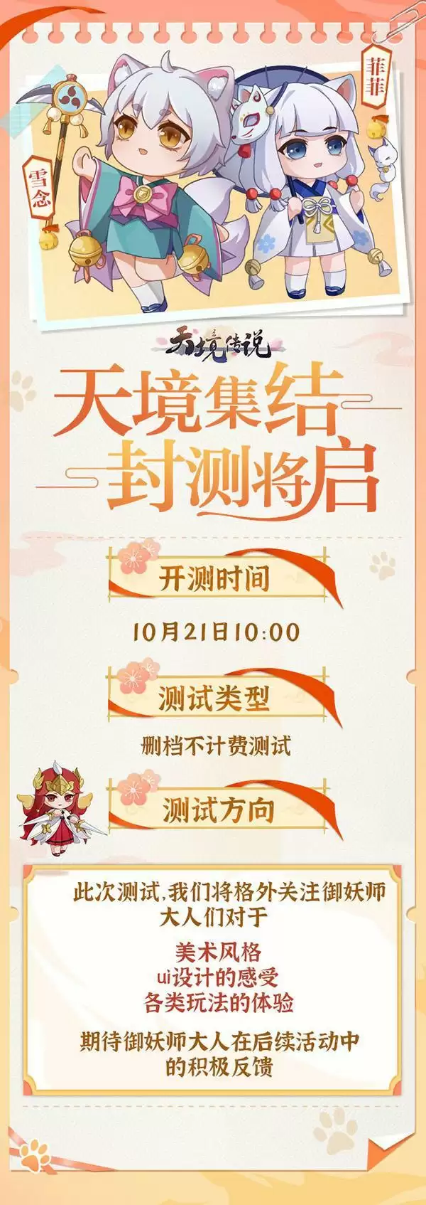 《天境传说》将于2021年10月21日正式开测,游戏主打放置养成的卡牌玩法,呆萌的游戏画风以及人物设定是很多玩家都非常喜爱的,在玩法上也是进行了多种融合以及创新,让玩家在对战的同时能够体验到更多的玩法元素。