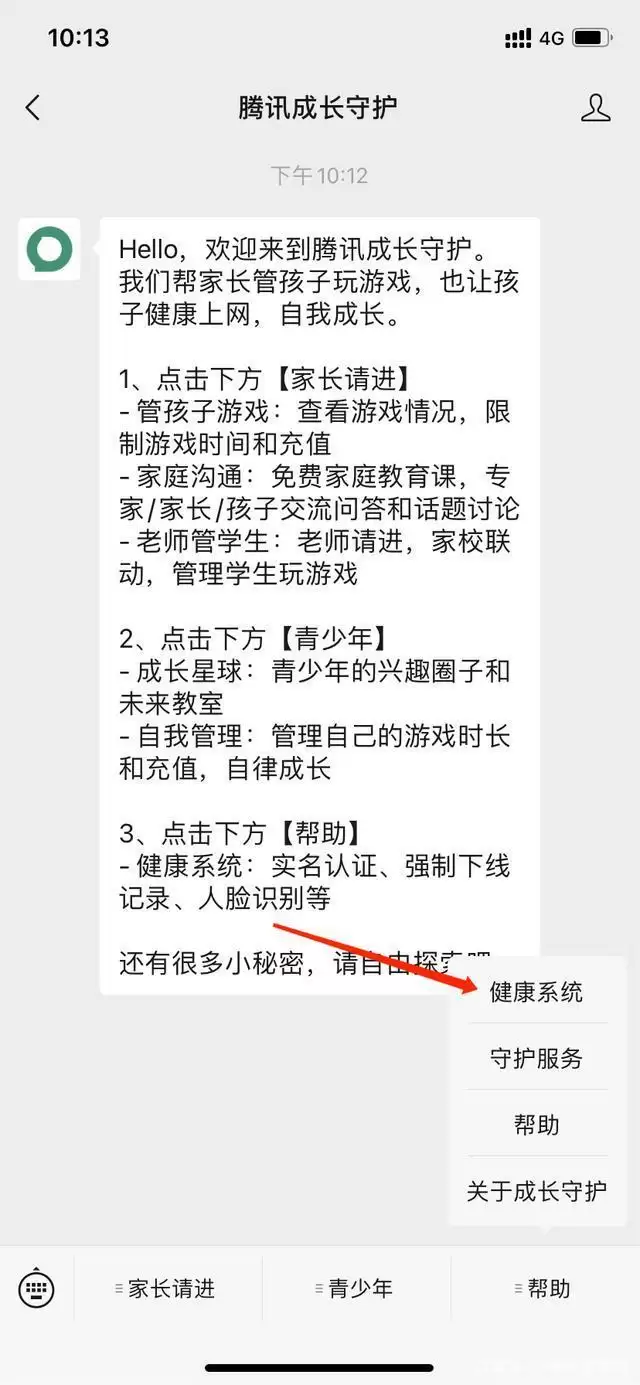 第二步:当我们进入腾讯成长守护平台发消息界面后,我们点击右下角的帮助,在弹出的界面框中我们选择健康系统。