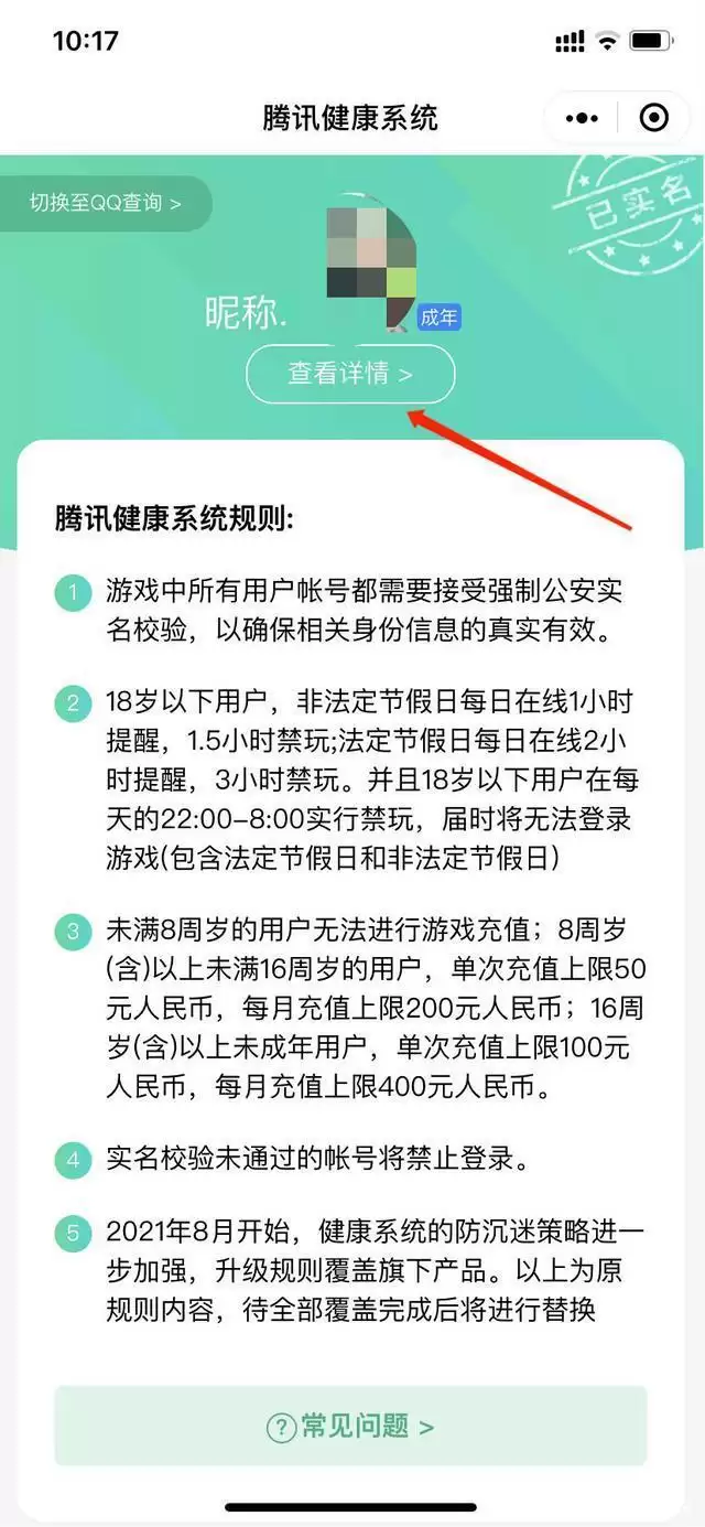 第四步:进入实名认证查询后,会显示我们微信所绑定的信息,想要确定是不是自己的实名信息认证,我们可以点击查看详情,这里小编已经显示成年了。