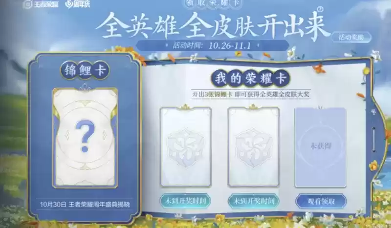 在30号的周年庆典周将会开启一年一次的盛典锦鲤活动,玩家可以领取三张荣耀卡片,如果翻到三张锦鲤卡片的话,则可以获得全皮肤全英雄的奖励。但是并不包括一些特殊英雄以及限定皮肤,不过这个奖励也比较吸引玩家。翻到两张锦鲤卡片可以获得高级皮肤3选1,也是不错的奖励。由于获得方式比较简单,玩家一定不要错过这个福利活动,万一获得全皮肤全英雄奖励,那真成锦鲤了!