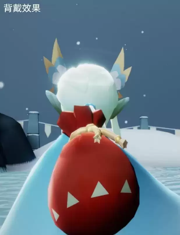 可放置,周围会有下雪效果,背戴状态下是一个红色的背袋。