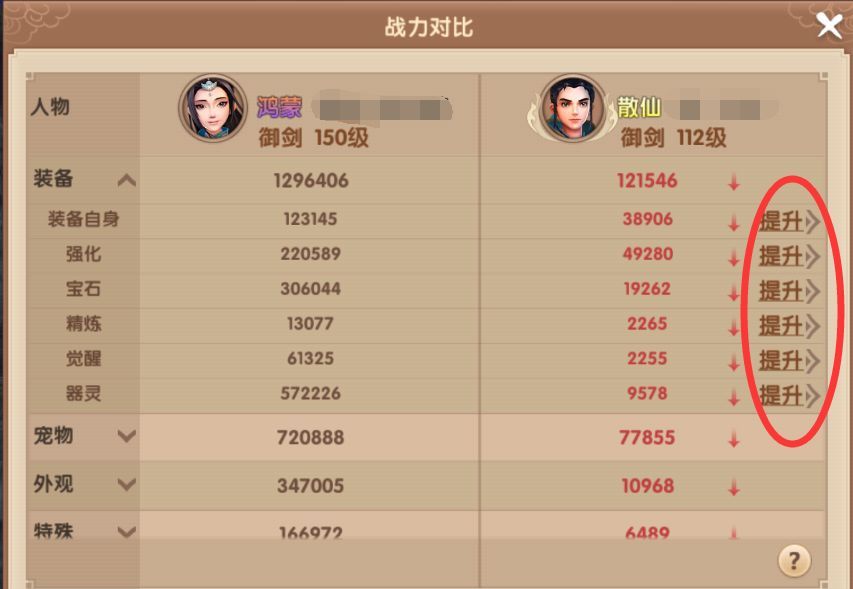 战力对比的图里可以更直观的看到大佬和你的细节战力对比,更方便提升战力(如下图)