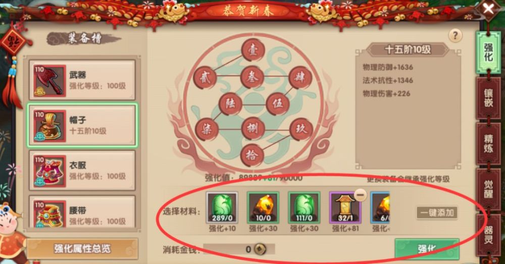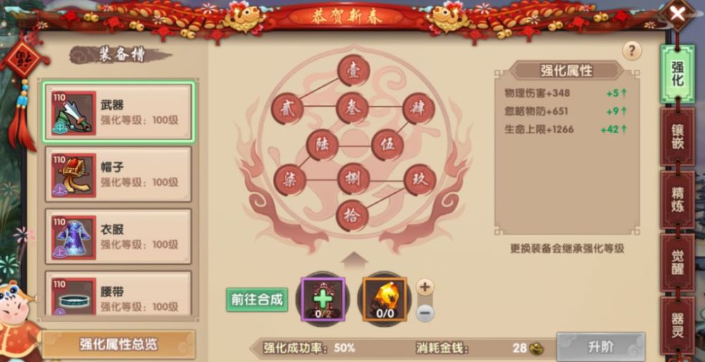 强化和自身角色的等级息息相关,每五级便能强化一次。想要提升这块的战力,只能升级和做任务,攒材料。只要迈过一百级强化这个坎,后期的强化只需要足够的材料一键强化,不会有失败几率了。