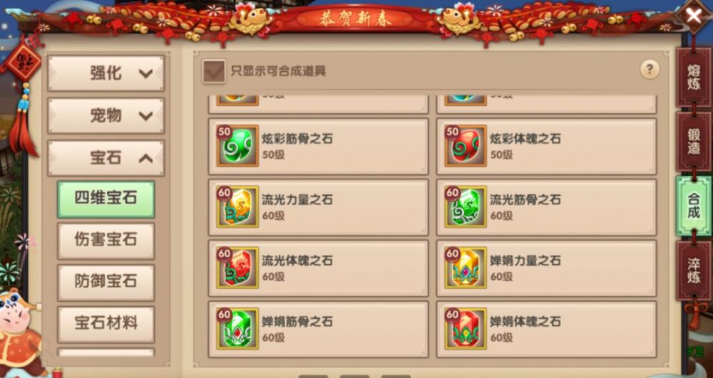 杀破狼,太极等稀有宝石合成配方界面依旧在:炼器-淬炼 中