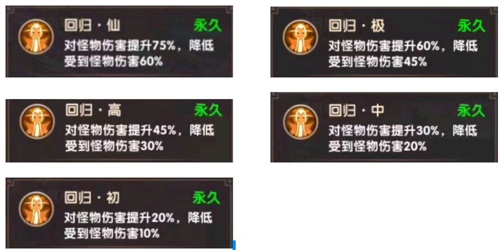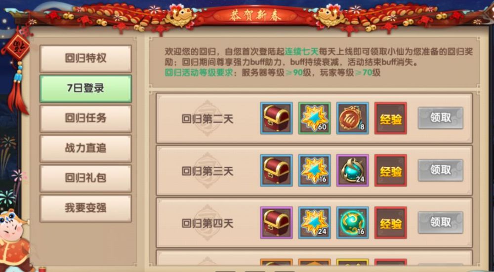 (玩家≥70级, 服务器≥90级的情况下,会有回归buff。
