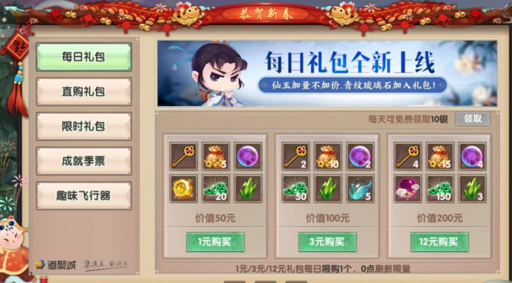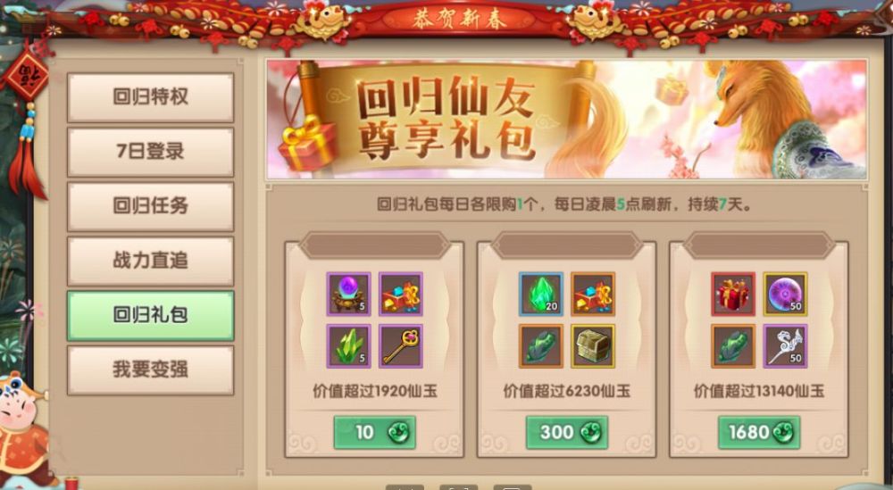 除此之外,条件允许的话,配合每日礼包的一元购买,领取回归礼包中的10仙玉礼包,我觉得是最值的,相当于用一元钱,在两天里共领取了11个琉璃石碎片,还有三把须弥纳宝盒的钥匙。