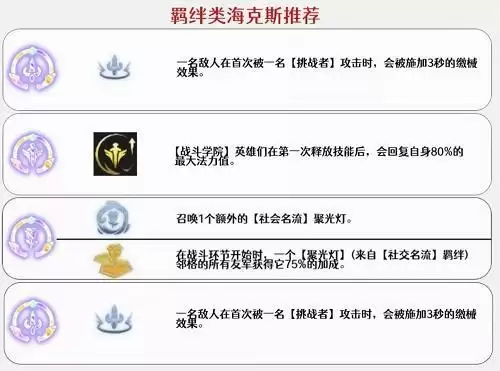 非羁绊类海克斯:黄金门票(免费D牌)、新人入队(+1人口)、高端购物(高概率刷牌)、升级咯(加经验)、明智消费(加经验)