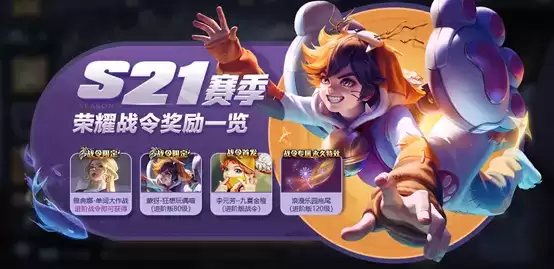S21进阶版荣耀战令奖励:雅典娜-单词大作战,蒙犽-狂想玩偶喵,李元芳-九夏金橙星元礼包,击败特效、回城特效礼包等。