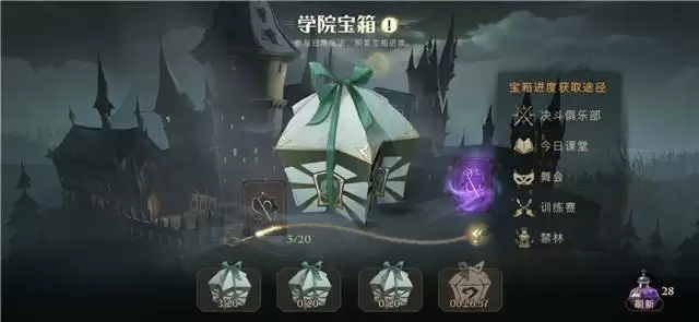 学院宝箱,就是游戏主界面左侧的活跃宝箱,完成任务可以开出不同等级的卡牌。一般紫色和金色的箱子,能开出少量宝石。学院活动是每周刷新,里面有单人决斗、双人决斗、魔法史、跳舞等内容,每周赢15把,即可拿到300宝石奖励。