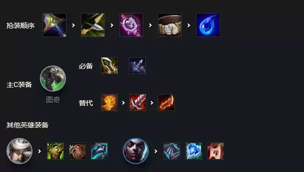 主C图奇:装备给上无尽,正义,轻语备选饮血,羊刀。