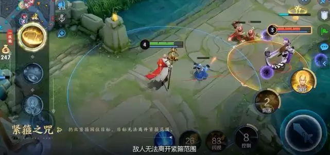 一技能是紧箍之咒,给目标套个圈,附加减速并且不能位移出去。