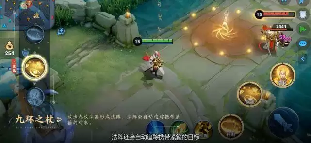 二技能九环之杖,释放法阵,通过叠加印记造成多段伤害。而且法阵会自动追踪携带紧箍的对象。