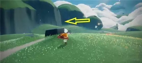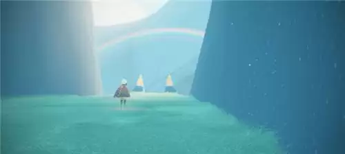 2、之后我们就能在山道的前方看到一个彩虹,直接往彩虹的方向飞行,然后就能看到彩虹的下面有两个石墩子;
