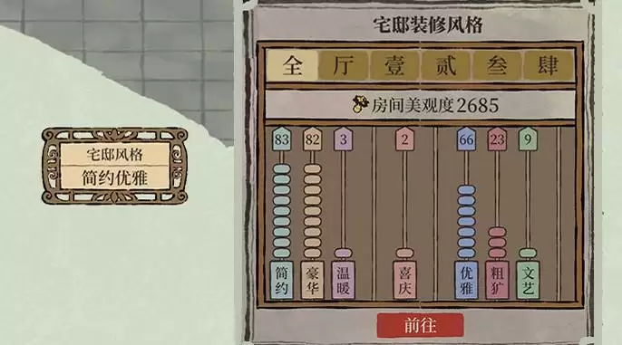 2、装修的整体风格也有很多种,包括了简约、优雅、华丽等12种装修风格,玩家们通过装修可以提高宅邸的美观度。