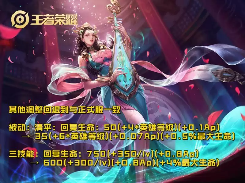 被动技能的回复效果,降低了基础,以及ap加成,但是增加了等级成长,以及生命值的加成,按照正式服的数据计算了一下,带的怜悯铭文,出门法强52,最大生命值2966,那么一 级的治疗效果就是53.44,正式服是55.2,基本持平。