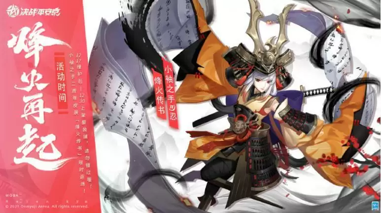 (12月12日),《决战平安京》在社交平台的正式账号上发布了一则新消息,宣布小袖之手二周年皮肤「烽火传书」即将开启限时返场。活动时间为12月17日维护后至12月30日,感兴趣的玩家不要错过。