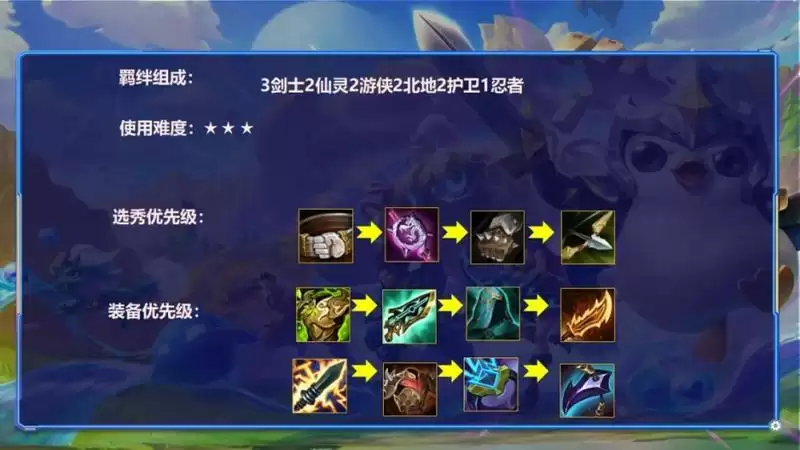 阵容组成:3剑士2仙灵2游侠2北地2护卫1忍者