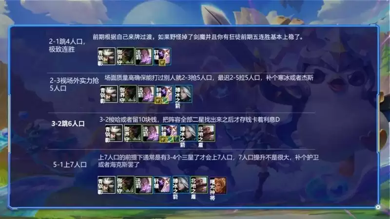 连胜3-1拉6人口,没连胜就正常3-2拉6人口即可,这局因为我场上质量还算过得去我就没怎么D牌,D了个两星机器人用着先,然后卡着50利息慢慢D即可(主要这把的装备我还没决定玩什么)