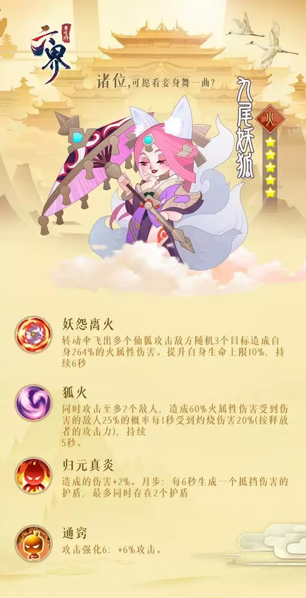 《六界召唤师》游戏中九尾妖狐是一位五星英雄角色,相信很多玩家都想要了解这个人物吧,那么今天小编就给大家介绍一下六界召唤师九尾妖狐技能,有需要的小伙伴不要错过了。