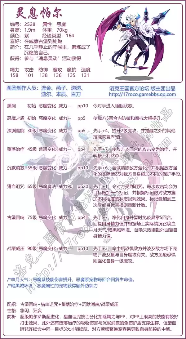 在《洛克王国》游戏中灵息帕尔由超级帕尔萨斯超进化而来,技能方面完全吃魔攻,速度也比较快,推荐速度努力252,魔攻努力252,生命4点即可。