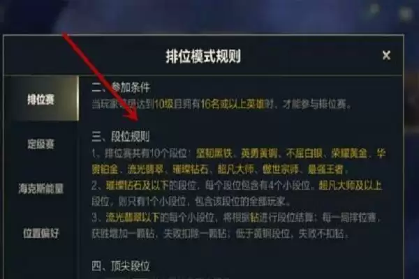 2、每一个大段位中包含四个小段位,例如:黄金段位分为黄金I、黄金II、黄金III、黄金VI。是这么算的,黑铁一、黑铁二、黑铁三、黑铁四、黑铁五,白银一、白银二、白银三、白银四、白银五。由低往高,黄金5下来白银一、白银五下来黑铁一。