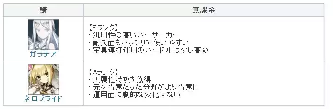 新英灵伽拉忒亚是拥有自充及战续的狂阶,并且还拥有全体回血与解除弱化状态等辅助性技能,所以泛用性很高,在开荒期可以面对多种职介的敌人。对于新人来说唯一美中不足的是难以宝具连发。