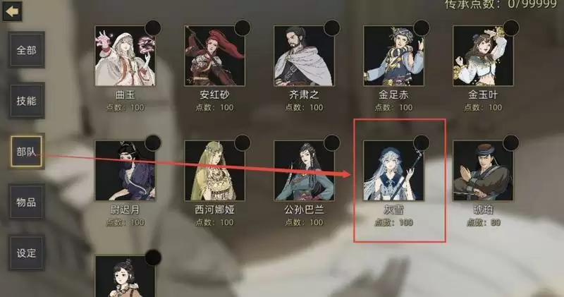 2、然后点击灰雪,使用传承点100。