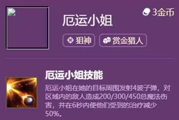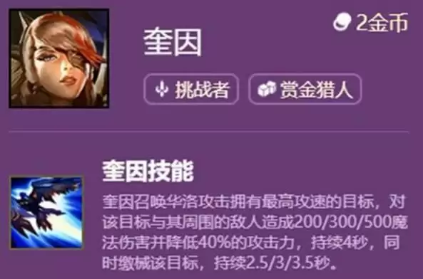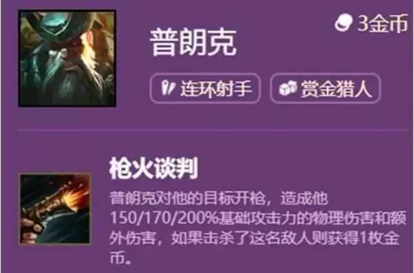 场上有 3 个【赏金猎人】时,你的备战席将出现一个宝箱,获得一场胜利后宝箱将开启。每个备战阶段开始时,你将投出两个骰子,为宝箱增加更多战利品。获得宝箱与开启宝箱的时间隔得越远,获得的战利品越好。如果你场上有 5 名【赏金猎人】,骰子将带来更多好运!【赏金猎人】达到 7 名时,获胜后将投出一枚金骰子——【(7)赏金猎人】是孤注一掷的打法。